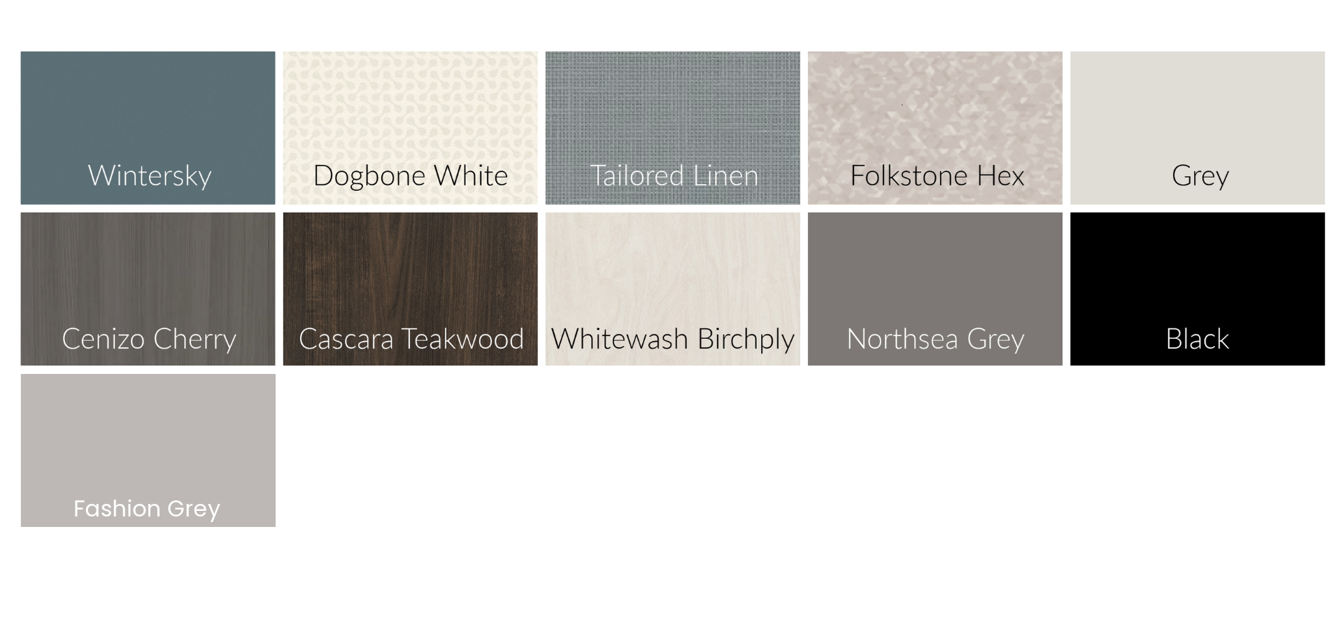 Laminate Choices: White Dry Erase, Wintersky, Dogbone White, Tailored Linen, Folkstone Hex, Grey, Chenizo Cherry, Cascara Teakwood, Whitewash Birchply, Northsea Grey, Black, Fashion Grey