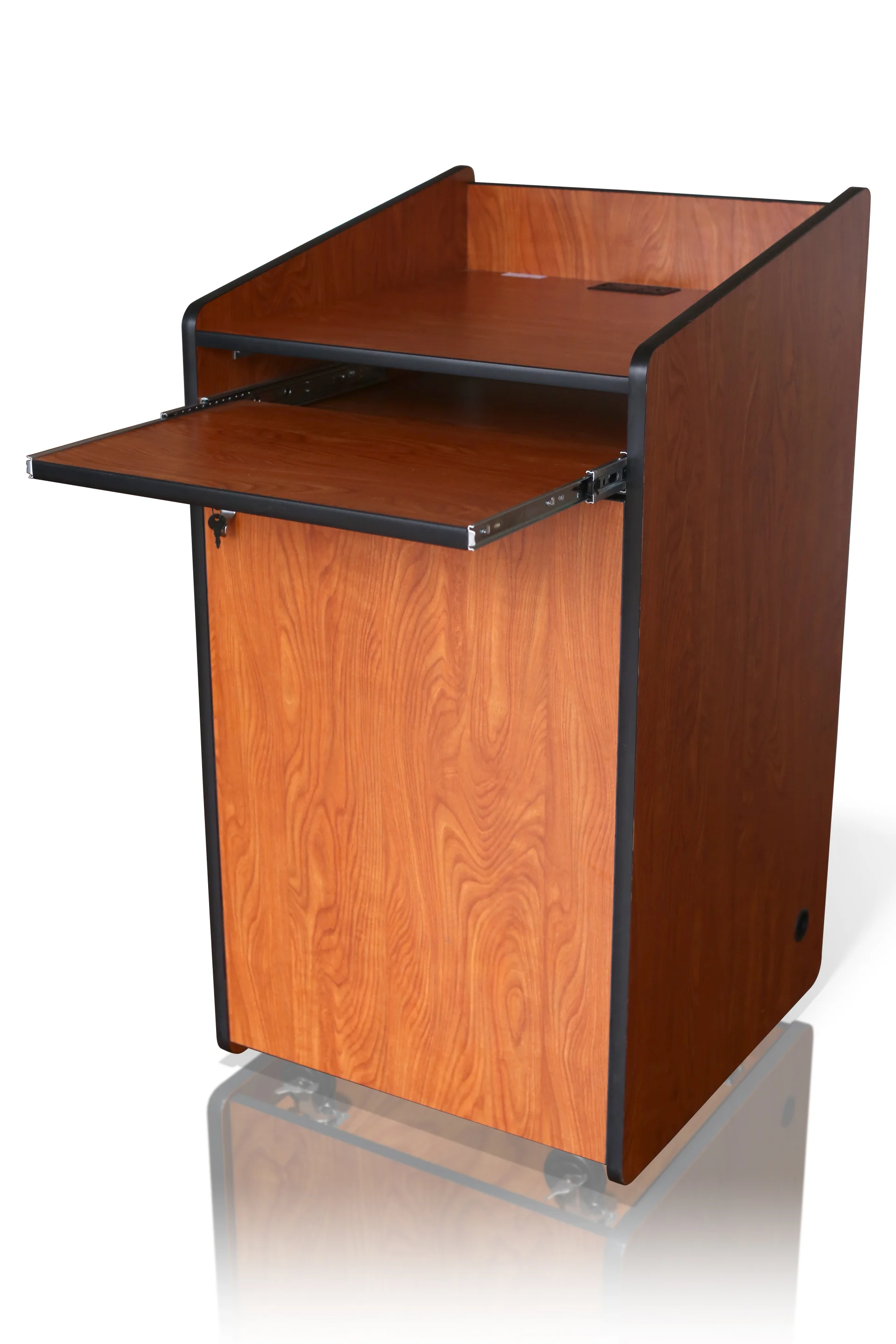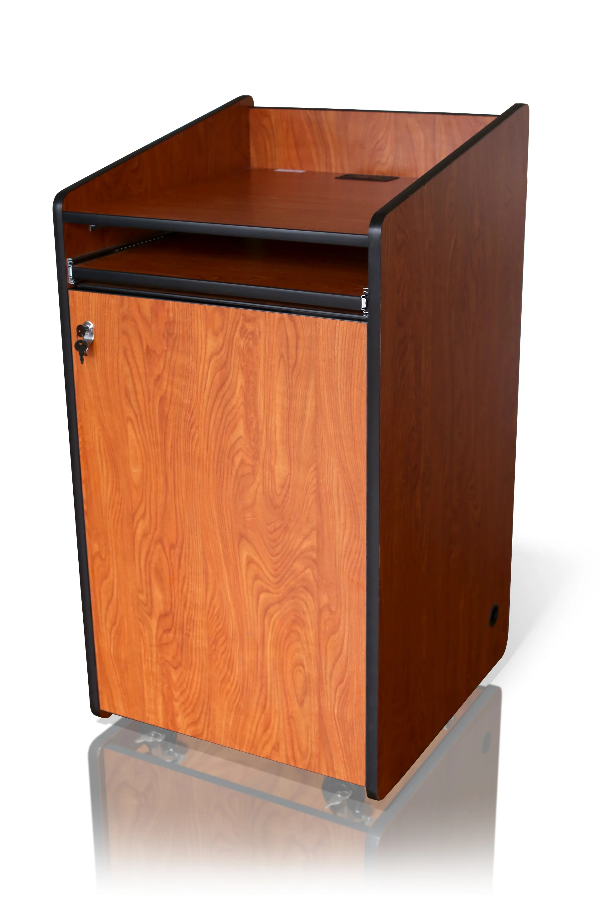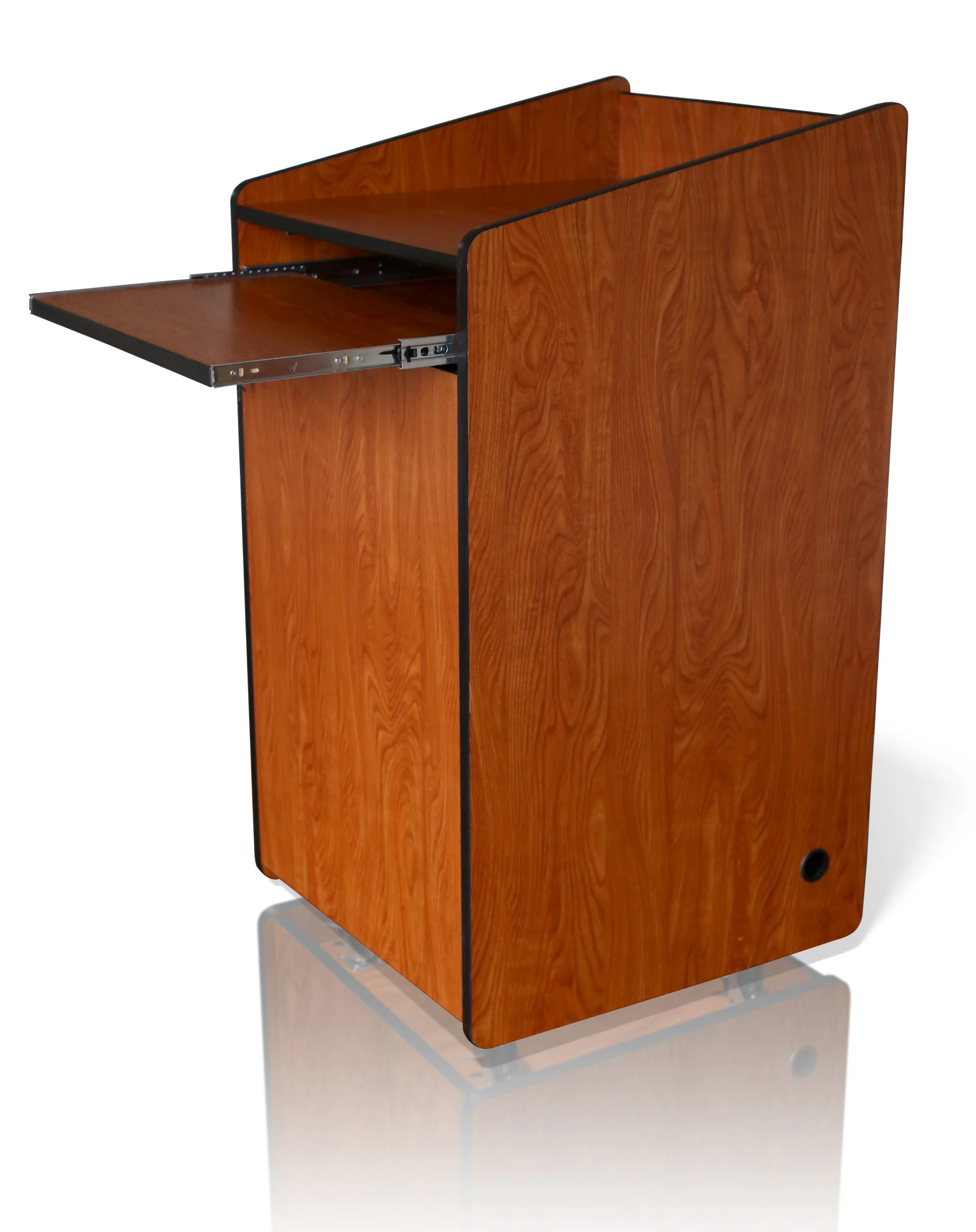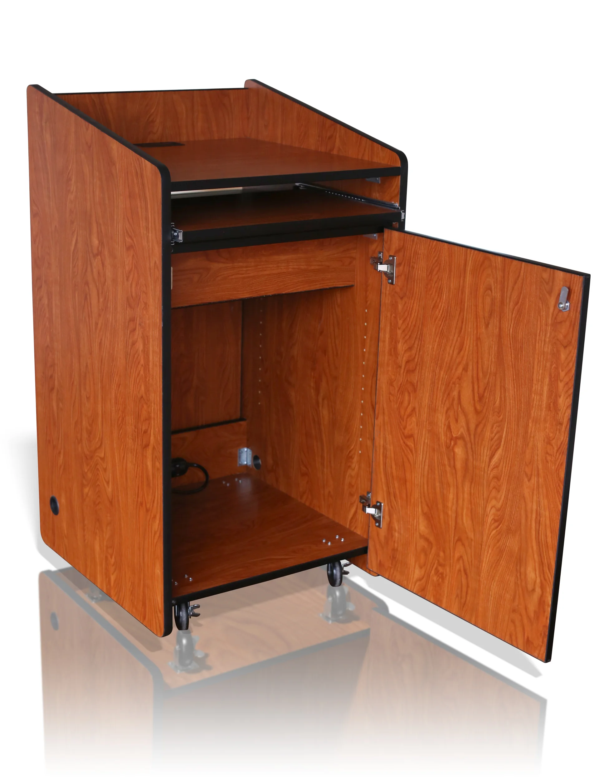 Great for any instructional setting! The LE lectern has many versatile set-ups for your classroom. The top offers enough space for a laptop or monitor and has a rectangular grommet hole with cable holder insert. It also has a pull-out shelf at the top for a keyboard or for storage, and an adjustable shelf on the inside. The LE25 is on 3" locking swivel casters and has front and rear locking doors for security and ease of access to cables. An optional side folding shelf can be added upon request.